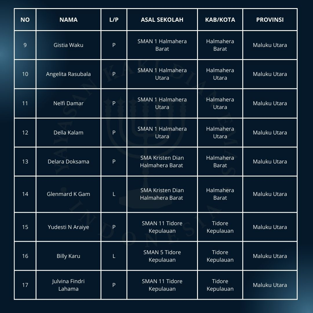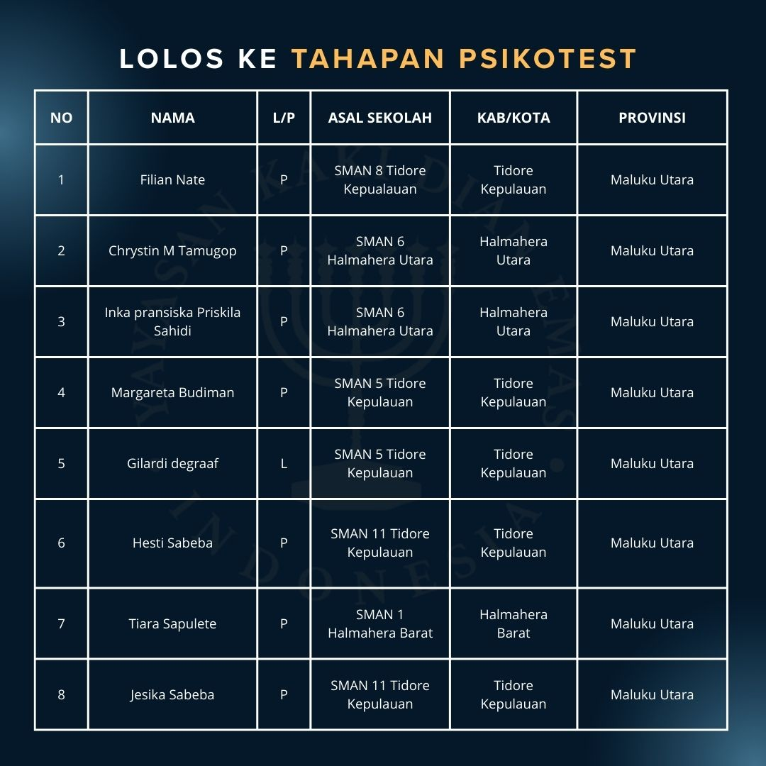 Kami mengucapkan terima kasih atas kesabaran Siswa/i Peserta seleksi di wilayah Maluku Utara yang telah menunggu hasil seleksi sejak 31 Januari 2026. Dengan ini, kami umumkan daftar nama peserta yang berhak melaju ke tahap berikutnya.